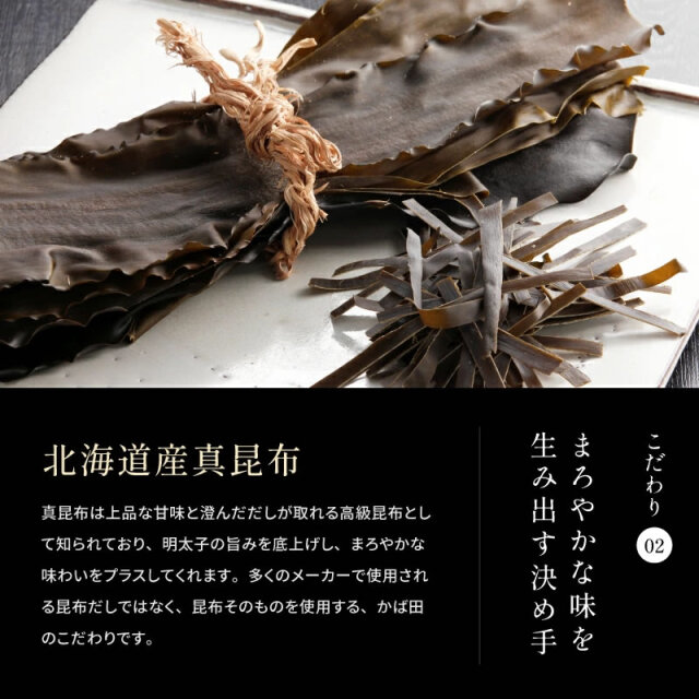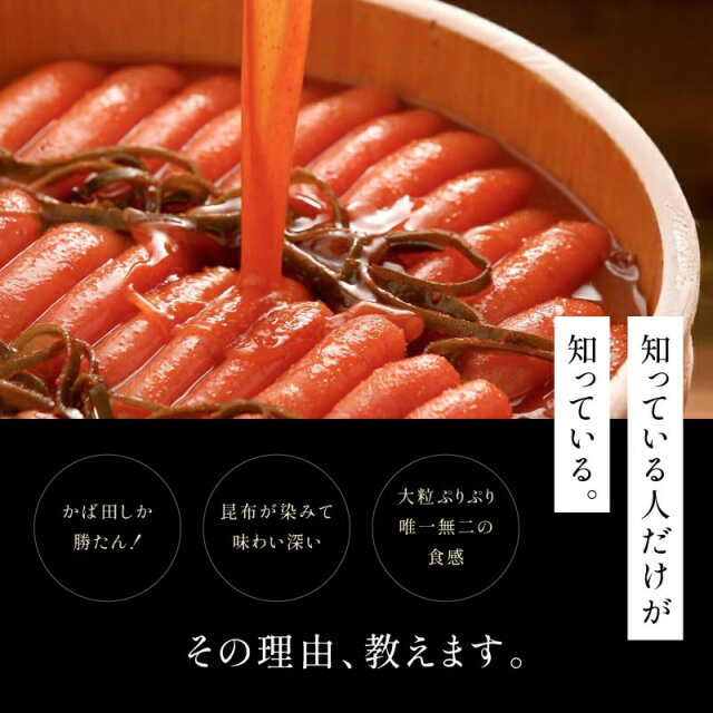 | 原材料 | すけとうだらの卵巣(米国産)、昆布、発酵調味料、かつお節エキス、清酒、還元水飴、食塩、唐辛子、たん白加水分解物、イカスミ/調味料(アミノ酸等)、酒精、ソルビット、トレハロース、酸化防止剤(V.C)、増粘剤(キサンタン)、着色料(黄5、赤102、赤3)、pH調整剤、発色剤(亜硝酸Na)、酵素、(一部に大豆・ゼラチンを含む) |