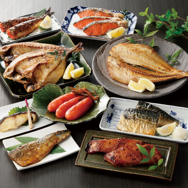 昆布漬辛子めんたい『雷』 150g 塩さば 1尾(1尾あたり約35cm、480g〜500g前後) あじの開き干し 2枚 ※真空済 いわしの明太子漬 2尾 さばの糠味噌炊き 1切 銀だらの西京漬 1枚 縞ほっけの開き 1尾 中辛塩 紅鮭の切身 約70g×3枚 かれいの味醂干し 2枚 |